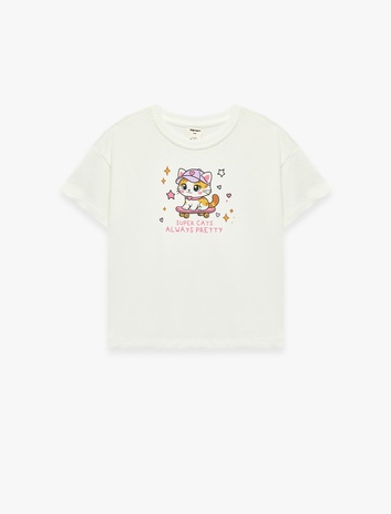 Pamuklu Kısa Kollu Bisiklet Yaka Kedi Baskılı Tişört Sepete Ekle