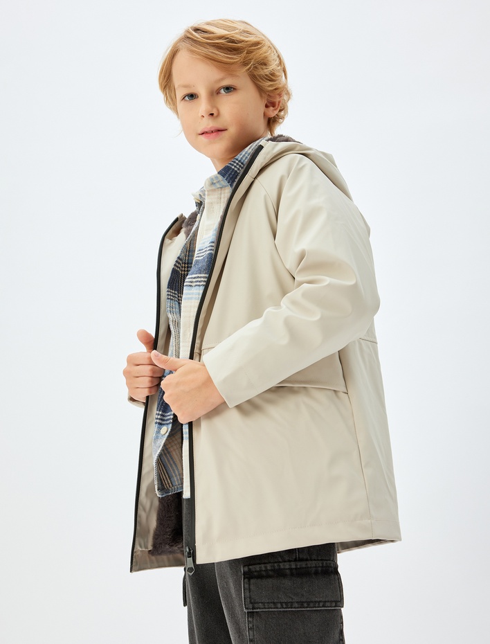 Erkek Çocuk Kapşonlu Yağmurluk Peluş Astarlı Su Geçirmez Kapaklı Cepli