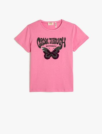 Kız Çocuk Tişört Kısa Kollu Bisiklet Yaka Kelebek Pul Payet İşlemeli Pamuklu