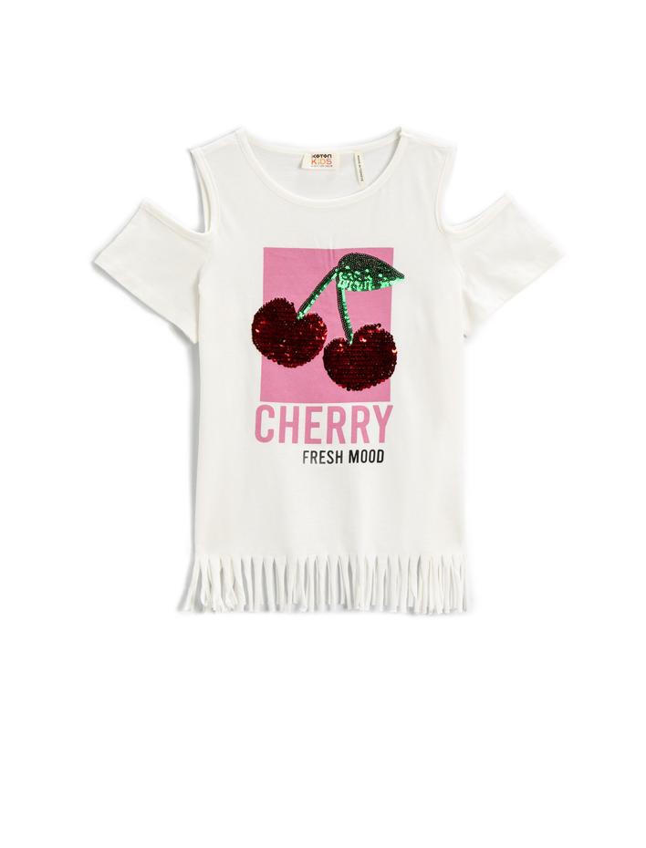 Omzu Pencere Detaylı Püsküllü Tişört Kiraz Desenli Pullu Payetli Pamuklu Sepete Ekle