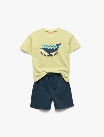 Balina Baskılı Bisiklet Yaka Kısa Kollu Pamuklu Tişört ve Şort Seti Sepete Ekle