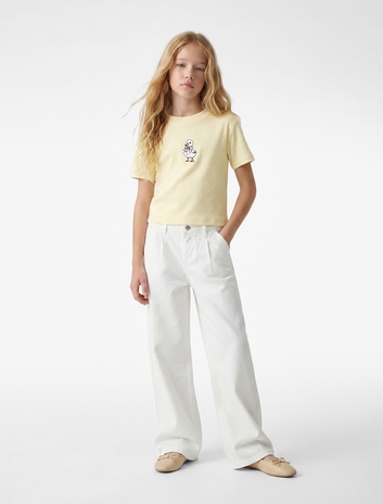 Kız Çocuk Pamuklu Ördek Nakışlı Bisiklet Yaka Kısa Kollu Tişört