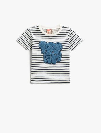 Erkek Bebek Fil Desenli Çizgili Tişört Kısa Kollu Bisiklet Yaka Pamuklu