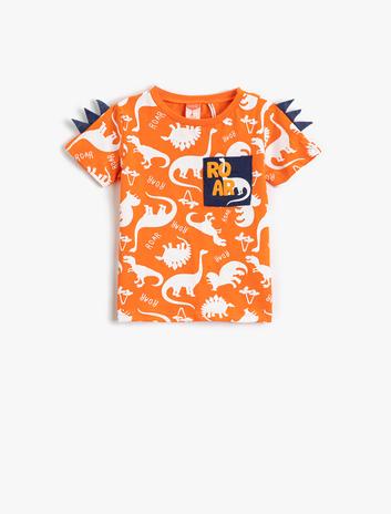 Dinozor Baskılı Kısa Kollu Tişört Aplike Detaylı Bisiklet Yaka Pamuklu Sepete Ekle