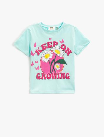 Kız Çocuk Tişört Kısa Kollu Bisiklet Yaka Baskılı Fitilli