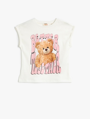 Kız Çocuk Tişört Kısa Kollu Bisiklet Yaka Ayıcık Baskılı Pamuklu