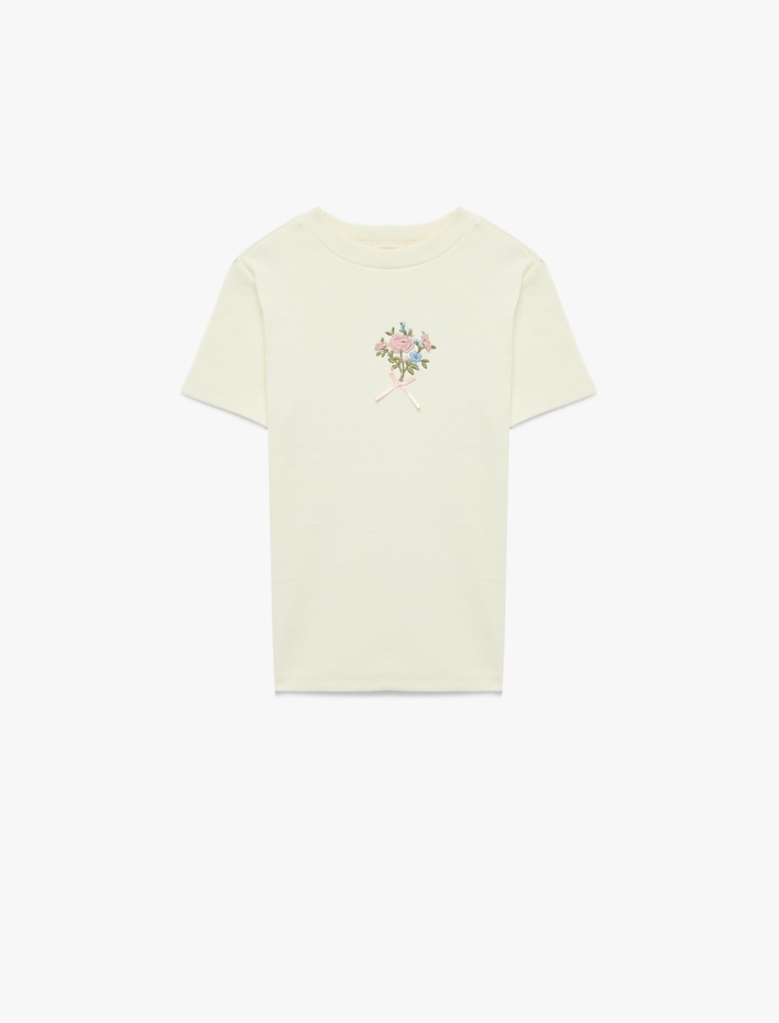 Pamuklu Çiçek Nakış Detaylı Kısa Kollu Bisiklet Yaka Tişört Sepete Ekle