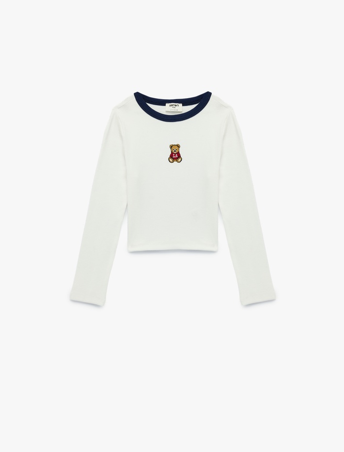 Uzun Kollu Bisiklet Yaka Ayıcık Nakış Detaylı Pamuklu Crop Tişört Sepete Ekle
