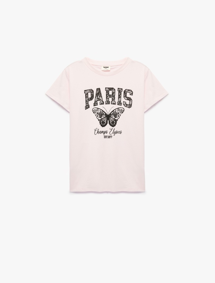 Pamuklu Kısa Kollu Bisiklet Yaka Kelebek Baskılı Tişört Sepete Ekle