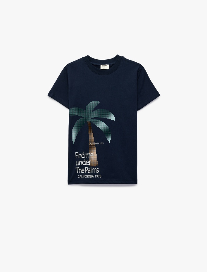 Kısa Kollu Bisiklet Yaka Pamuklu Palmiye Baskılı Tişört Sepete Ekle