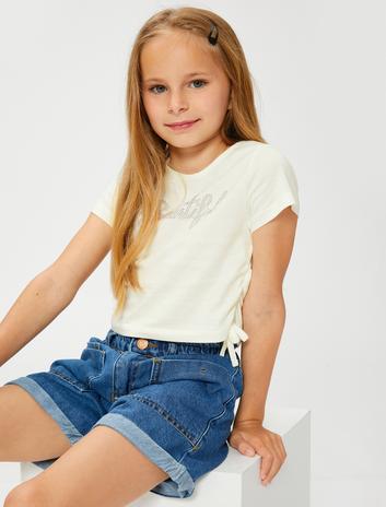 Kız Çocuk Tişört Pamuklu Kısa Kollu Yanları Bağlamalı İşleme Detaylı Yuvarlak Yaka