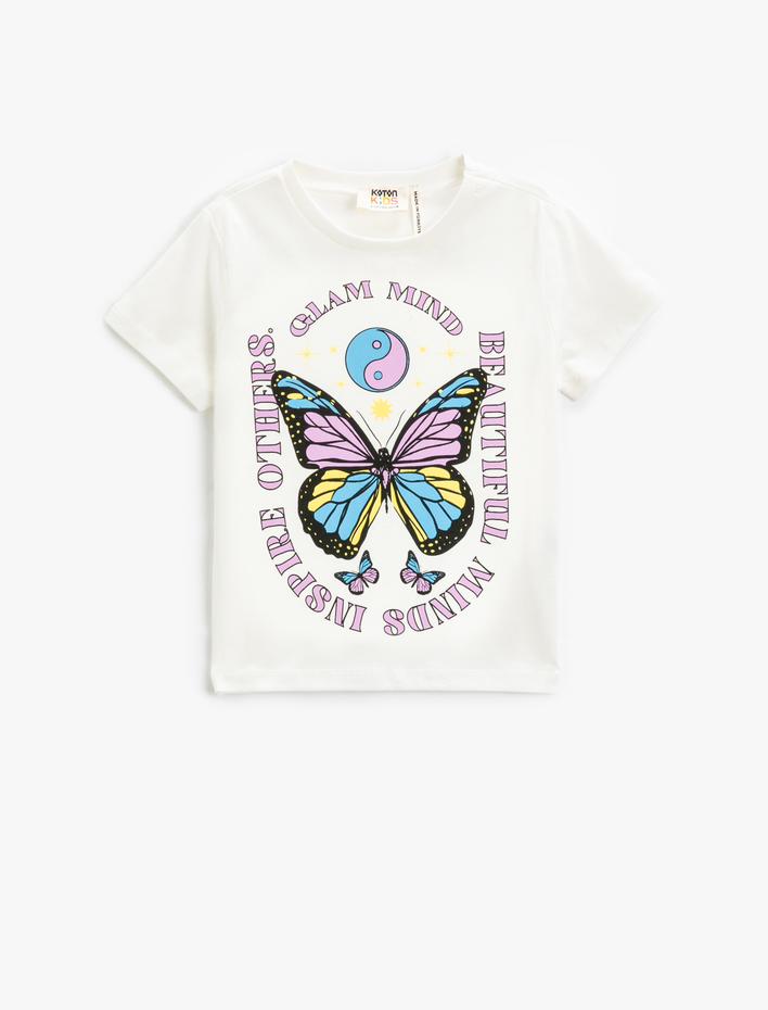 Kız Çocuk Kelebek Baskılı Pamuklu Tişört Kısa Kollu Bisiklet Yaka