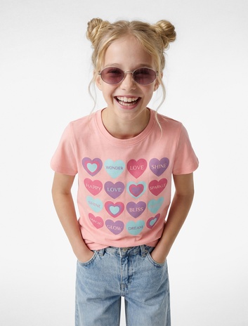 Kız Çocuk Pamuklu Kısa Kollu Bisiklet Yaka Kalp Baskılı Tişört