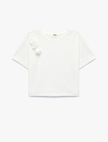 Çiçek Aplikeli Pamuklu Kısa Kollu Bisiklet Yaka Tişört Sepete Ekle