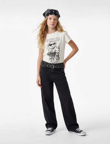 Pamuklu Kısa Kollu Bisiklet Yaka Ayıcık ve Tavşancık Baskılı Tişört Sepete Ekle