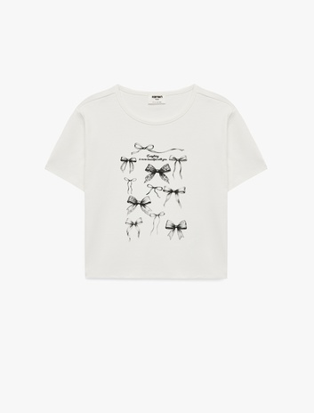 Baskılı Kısa Kollu Bisiklet Yaka Pamuklu Crop Tişört Sepete Ekle