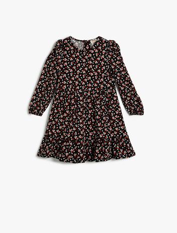 Çiçekli Elbise Fırfır Kollu Dokulu Yuvarlak Yaka Sepete Ekle