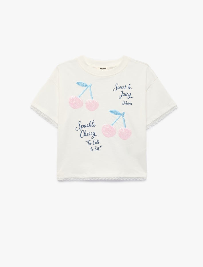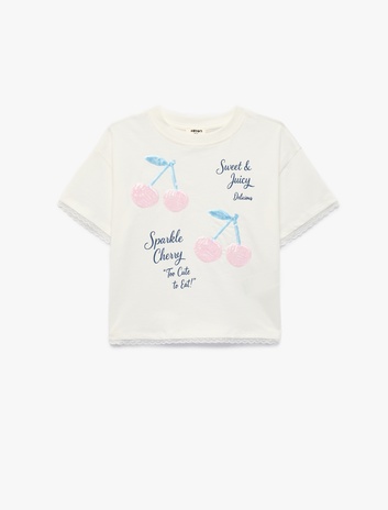 Pamuklu Kısa Kollu Bisiklet Yaka Kiraz Baskılı Pullu Payetli Tişört Sepete Ekle