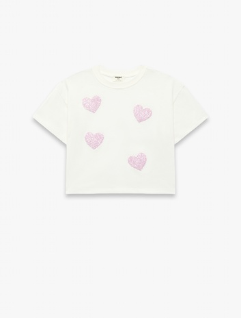 Bisiklet Yaka Pullu Payetli Kalpli Pamuklu Kısa Kollu Tişört Sepete Ekle