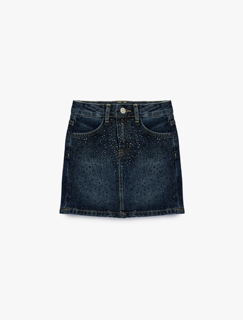 Kız Çocuk Pamuklu Cepli Taş Detaylı Mini Denim Etek