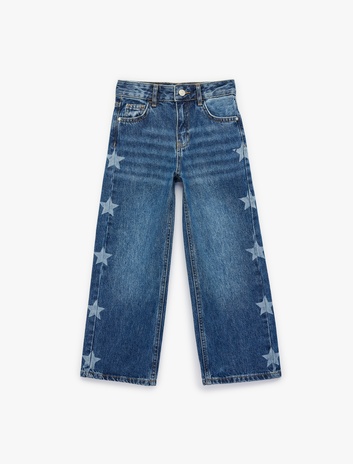 Kız Çocuk Pamuklu Taş Detaylı Geniş Paça Denim Pantolon