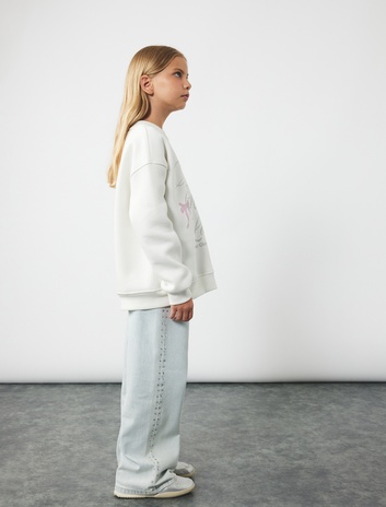 Kız Çocuk Pamuklu Rahat Kesim Zımba Detaylı Geniş Paça Denim Pantolon