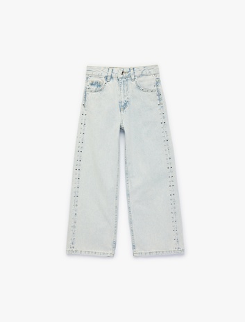 Kız Çocuk Pamuklu Zımba Detaylı Geniş Paça Denim Pantolon