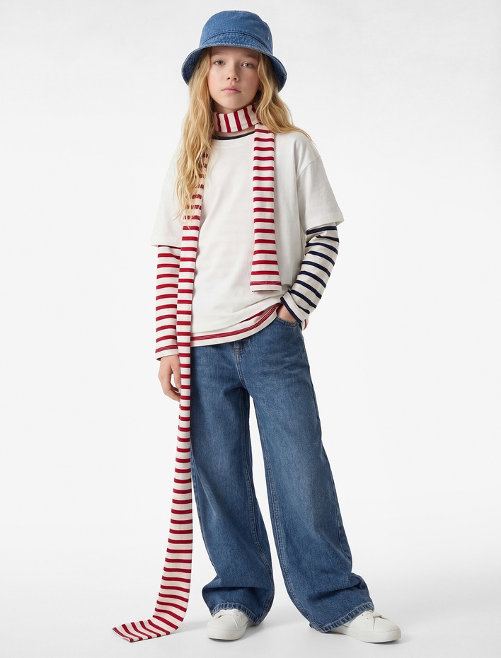 Kız Çocuk Pamuklu Çizgili Geniş Paça Jean Pantolon