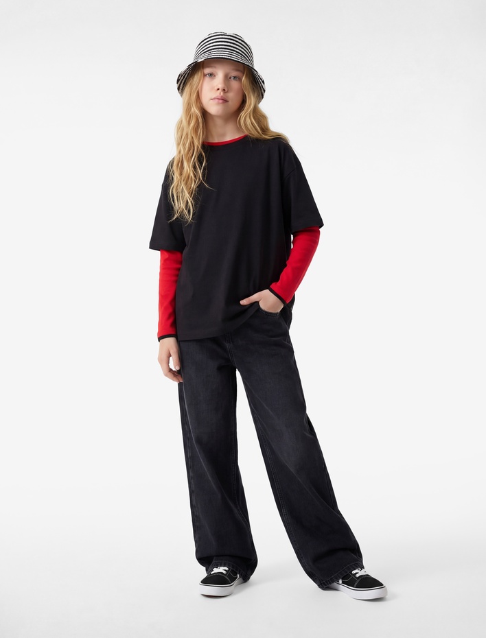 Kız Çocuk Pamuklu Şerit Detaylı Geniş Paça Jean Pantolon