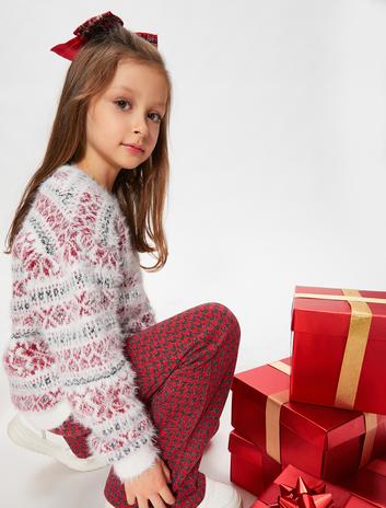 Kız Çocuk Çiçek İşlemeli Kazak Yumuşak Dokulu Uzun Kollu Yuvarlak Yaka
