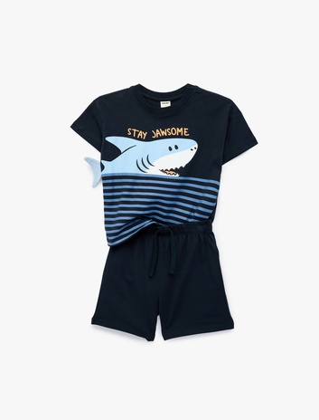 Pamuklu Aplikeli Köpekbalığı Baskılı 2'li Tişört ve Şort Seti Sepete Ekle
