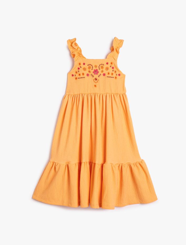 Kız Çocuk Elbise Askılı Fırfırlı Midi Boy Çiçek İşlemeli