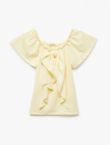 Bürümcük Kumaş Fiyonklu Omzu Açık Fırfırlı Kısa Kollu Bluz Sepete Ekle