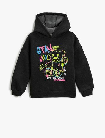 Kız Çocuk Kapşonlu Sweatshirt Grafiti Temalı Ayıcık Baskılı Uzun Kollu Şardonlu