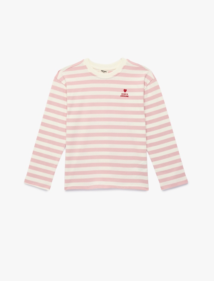 Pamuklu Uzun Kollu Bisiklet Yaka Nakışlı Çizgili Tişört Sepete Ekle