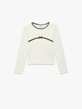 Uzun Kollu Dantel ve Fiyonk Detaylı Bisiklet Yaka Pamuklu Tişört Sepete Ekle