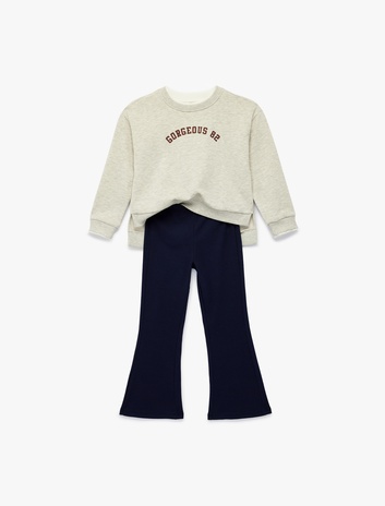 Baskılı Uzun Kollu Şardonlu Sweatshirt ve İspanyol Paça Pantolon Takımı - 2'li Set Sepete Ekle
