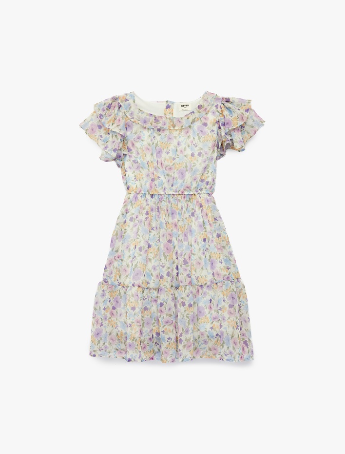 Bisiklet Yaka Fırfır Detaylı Katlı Çiçekli Şifon Elbise Sepete Ekle