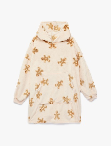 Kurabiye Adam Baskılı Uzun Kollu Oversize Kapşonlu Peluş Sabahlık Sepete Ekle