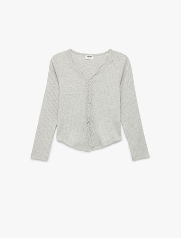 Dantel Detaylı Ribanalı V Yaka Uzun Kollu Tişört Sepete Ekle
