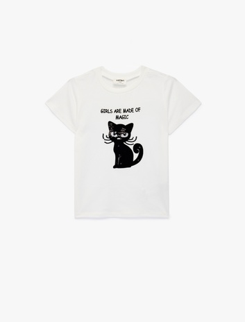 Pamuklu Kısa Kollu Bisiklet Yaka Kedi Baskılı Pullu Payetli Tişört Sepete Ekle