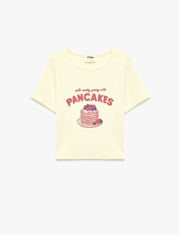 Baskılı Kısa Kollu Bisiklet Yaka Pamuklu Crop Tişört Sepete Ekle