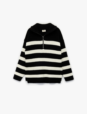 Yarım Fermuarlı Dik Yaka Uzun Kollu Çizgili Triko Kazak Sepete Ekle