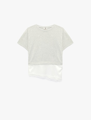 Dantel Detaylı Asimetrik Kesim Bisiklet Yaka Kısa Kollu Tişört Sepete Ekle