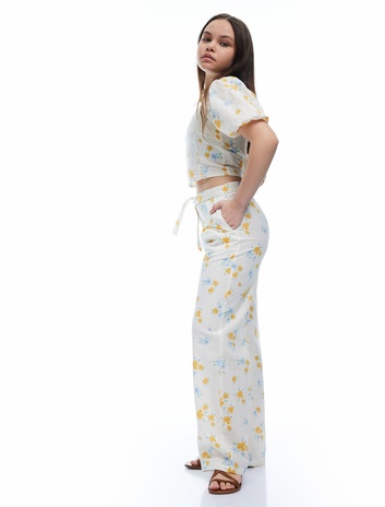 Pamuklu Çiçek Desenli Kemer Detaylı Geniş Paça Pantolon Sepete Ekle