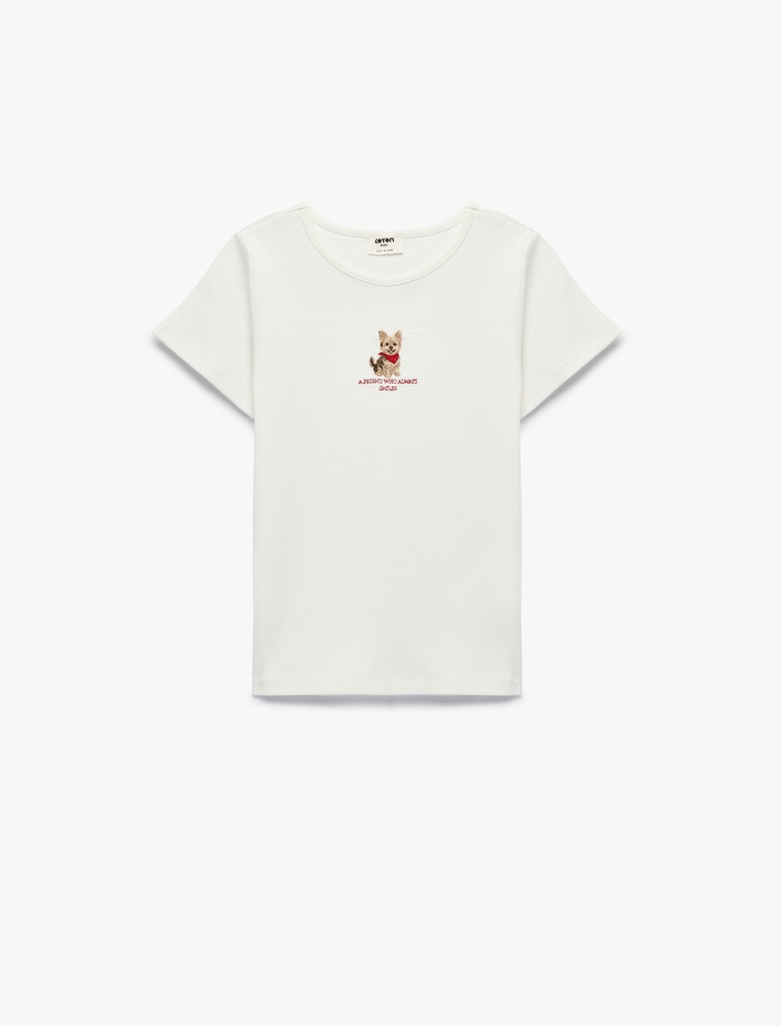 Kısa Kollu Bisiklet Yaka Köpek Nakış Detaylı Pamuklu Tişört Sepete Ekle