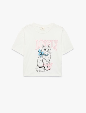 Bisiklet Yaka Kısa Kollu Pamuklu Kedi Baskılı Tişört Sepete Ekle