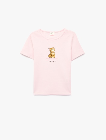 Pamuklu Bisiklet Yaka Kısa Kollu Kedi Baskılı Tişört Sepete Ekle