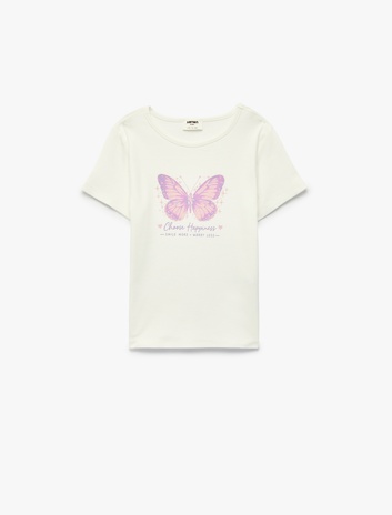 Pamuklu Kısa Kollu Bisiklet Yaka Kelebek Baskılı Tişört Sepete Ekle