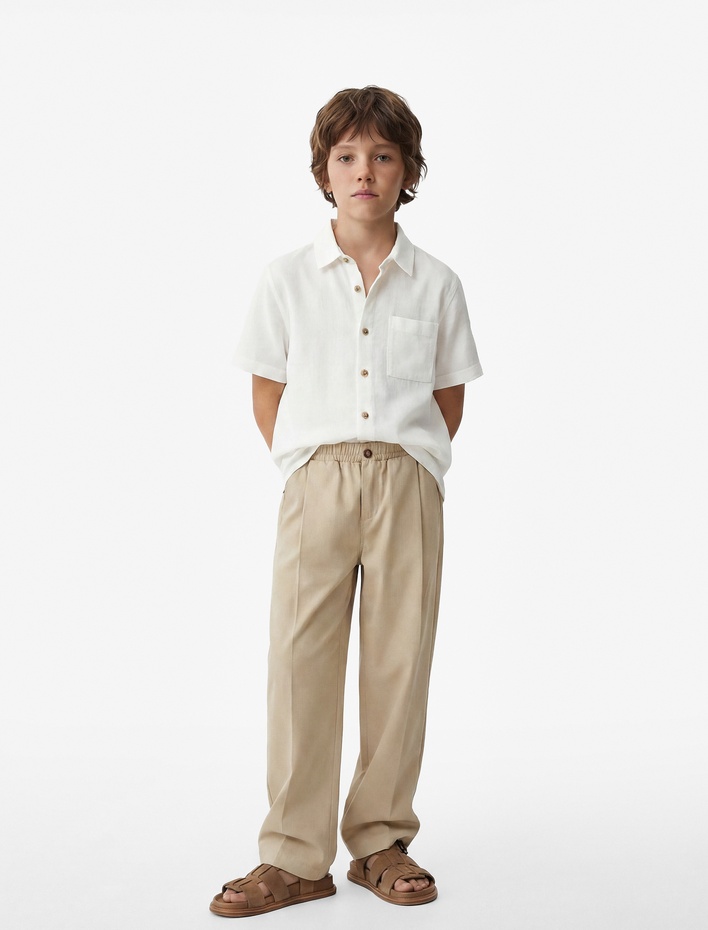 Erkek Çocuk Cepli Düğmeli Klasik Yaka Keten ve Viskon Karışımlı Kısa Kollu Gömlek